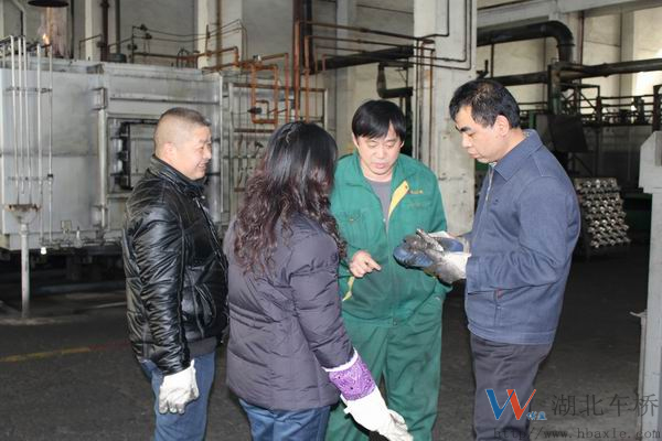 12月1日,依維柯齒輪質量呈現不規則波動跡象。熱處理車間相關人員立即碰頭進行現場分析,力求盡快明確診斷,采取相應控制措施。圖為滲碳壓淬工李永泉、資深熱處理技工趙建光、熱處理檢驗員曹玲、齒輪倒棱工陳國春在一起進行QC攻關。