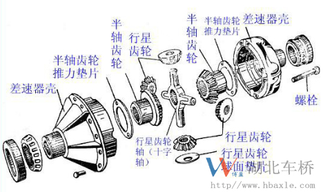 動力傳動路線:差速器殼體、行星齒輪軸、行星齒輪、半軸齒輪、半軸、驅動輪