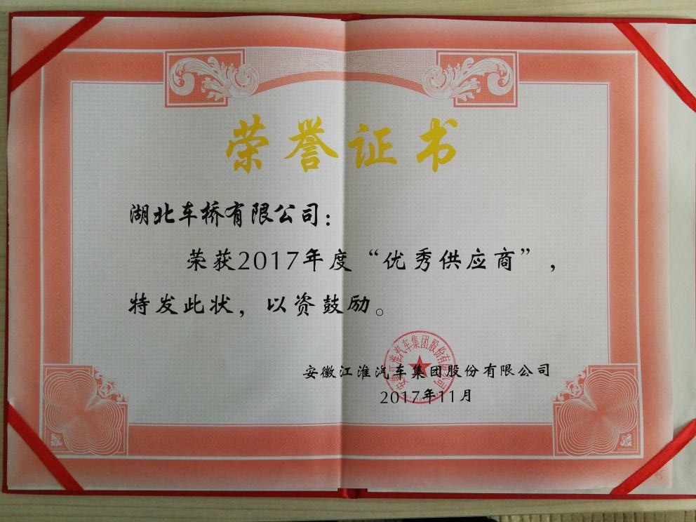 首頁 ? 新聞動態(tài) ? 喜訊:熱烈慶祝湖北車橋有限公司榮獲安徽江淮汽車集團股份有限公司2017年年度優(yōu)秀供應(yīng)商發(fā)布時間:2017-11-18